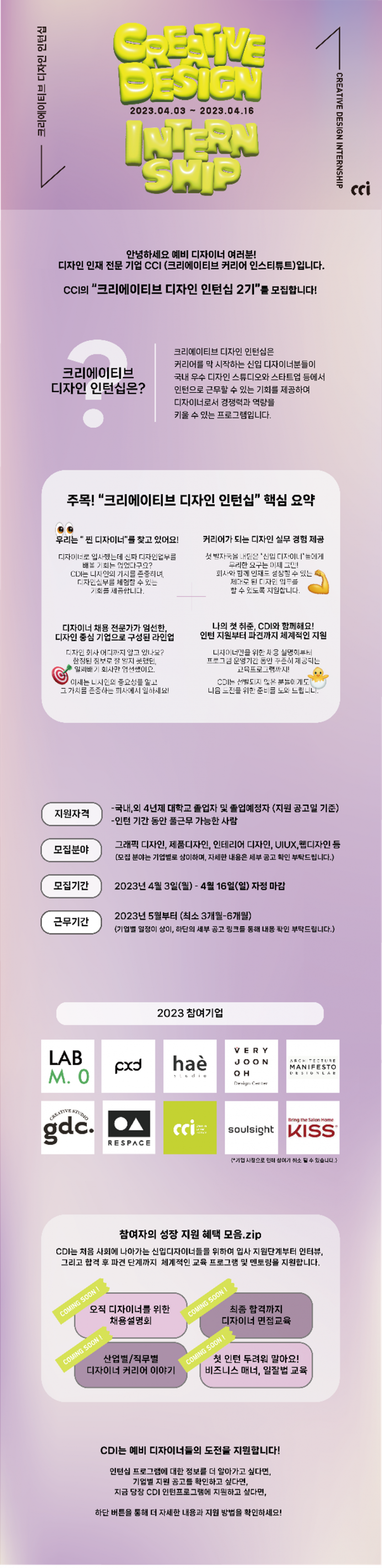그 어디에서도 볼 수 없었던 디자이너만을 위한 크리에이티브 디자인 인턴십 2기를 모집합니다.